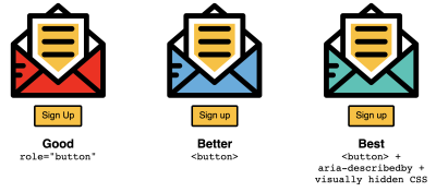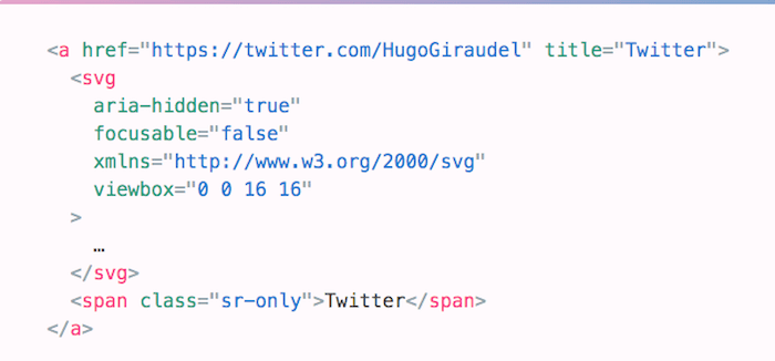 To show how we can do better, Kitty Giraudel dedicated an article “Accessible Icon Links” to the issue. They use an icon link consisting of an SVG with the iconic Twitter bird to illustrate the point, and shows step by step how to make it accessible: with a descriptive text that is visually hidden, then removing the SVG markup from the accessibility tree with aria-hidden, and, finally, correcting the fact that svg elements can be focused on Internet Explorer by adding the focusable attribute. At the end of the article, Kitty also shows how to turn all of this into a little React component.