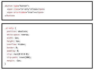 In “Accessible Close Buttons” Manuel Matuzovic goes into deep details highlighting 11 examples and patterns of inaccessible close buttons as well as 5 examples of close buttons that work fairly well. The easiest way to solve the problem is to provide a button with visible text and only visually accessible icon and ensure that the description by screen readers isn’t polluted by the icon’s description. Manuel also provides code examples of 5 close buttons that you can apply to your work right away.