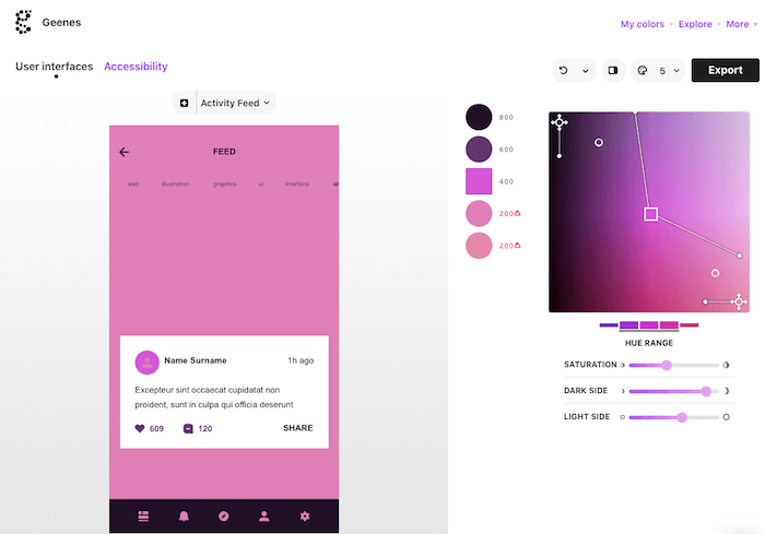 The tool lets you tinker with hue ranges and saturation and apply the color palettes to one of three selectable UI mockups. Once applied, you can trigger different kinds of vision impairments to see how affected people see the colors and, finally, make an informed decision on the best tones for your palette. To use the colors right away, just copy and paste their code or export them to Sketch. You can also emulate vision deficiencies in DevTools.