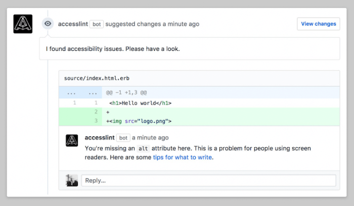 Maybe it’s a missing alt attribute or a heading structure that isn’t semantic, often it’s little accessibility issues like these that slip our attention and make it into production. The GitHub app AccessLint is here to prevent this from happening by bringing automated web accessibility testing into your development workflow: When you open a pull request or make edits to an existing one, AccessLint is already there, automatically reviewing the changes and commenting with any new accessibility issue before the code goes live.