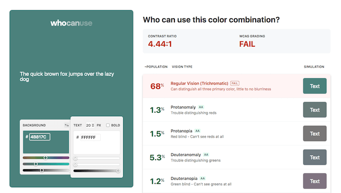 Enter a background and a text color and the tool calculates the contrast ratio as well as the WCAG grading for you. To humanize these rather abstract numbers, Who Can Use also shows a list of different vision types, how many people are affected by them, and, of course, the simulation of your color combination for each type. A great little helper to better understand the effect of color.