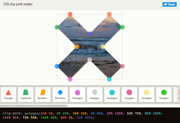 To start off, you select a shape and a demo background from Clippy’s menu. You can then drag the shape’s points to create any shape you like — the color-coded CSS will not only reflect your changes instantly but also highlight them to help you understand how your choices influence the code.