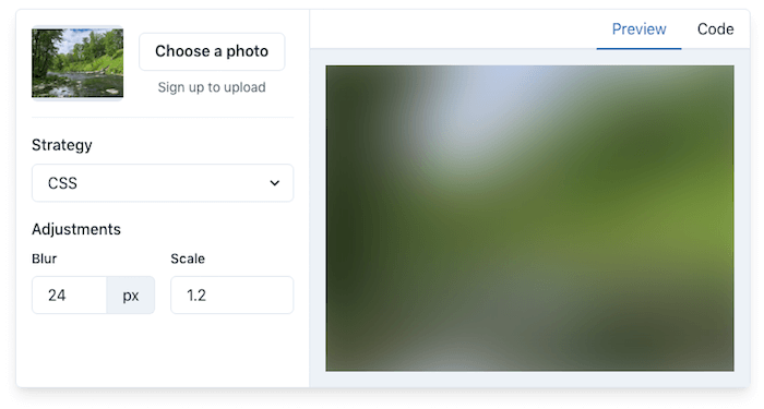 Powered by a collection of Node.js helpers, Plaiceholder turns your images into lightweight, blurred placeholder images. There are several approaches to choose from: CSS (which is recommended), SVG, Base 64, Blurhash, and the experimental Blurhash to CSS.