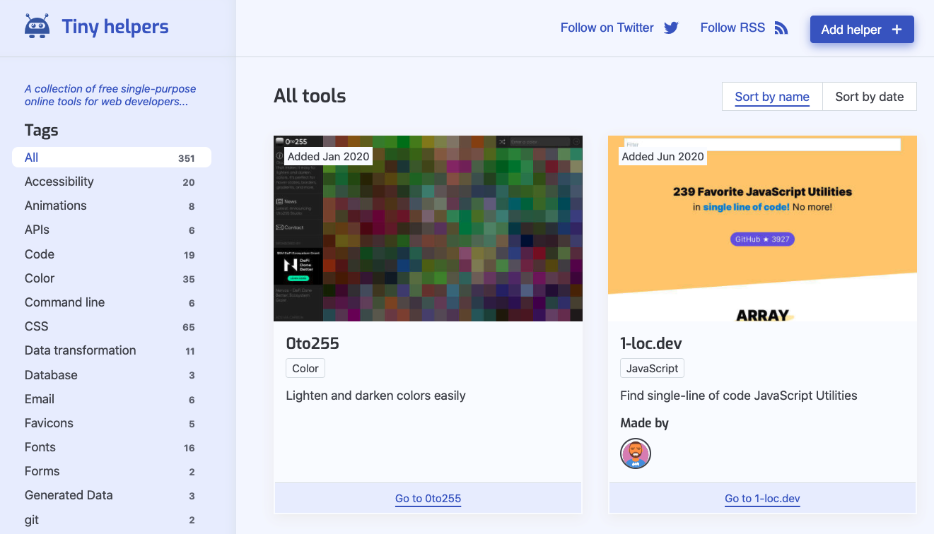 If you need a few more tools in your life, luckily, there are a lot of good ’ol web developers collecting their favorite useful tools all in one place named Tiny Helpers. Maintained by Stefan Judis, you’re sure to find all sorts of tools: from APIs, accessibility and color, to fonts, performance, regular expressions, SVG, and Unicode.