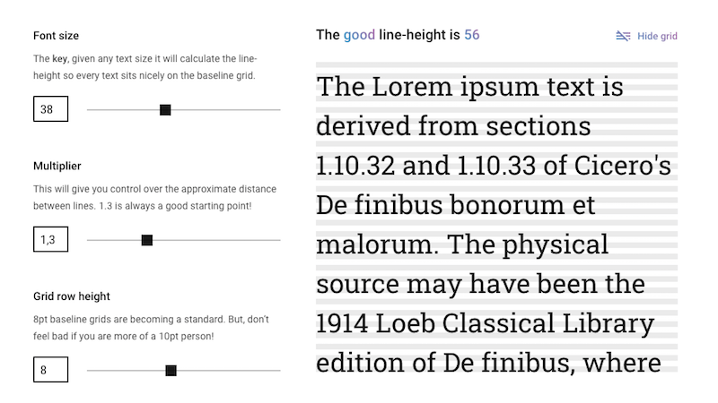 To calculate the results, you only need to enter three parameters: font size, multiplier, and grid row height. Font size is the key to ensure your text sits nicely on the baseline grid, no matter the text size, the multiplier gives you control over the distance between lines, and grid row height defines the height of each row in your baseline grid.