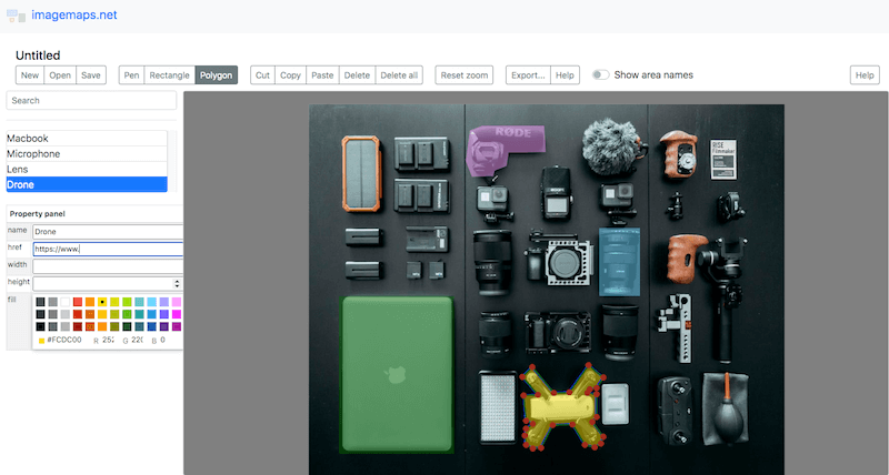 The site features a graphical user interface to make the process more straightforward. Once you’ve uploaded your image, you can use the Pen, Rectangle, and Polygon tools to draw your clickable regions. To customize them and, most importantly, give them their functionality, you can then name each region, assign a link to it, and adjust its color, height and width. A click on the “Export” button provides you with the HTML map and React code that you can copy and paste into your project.