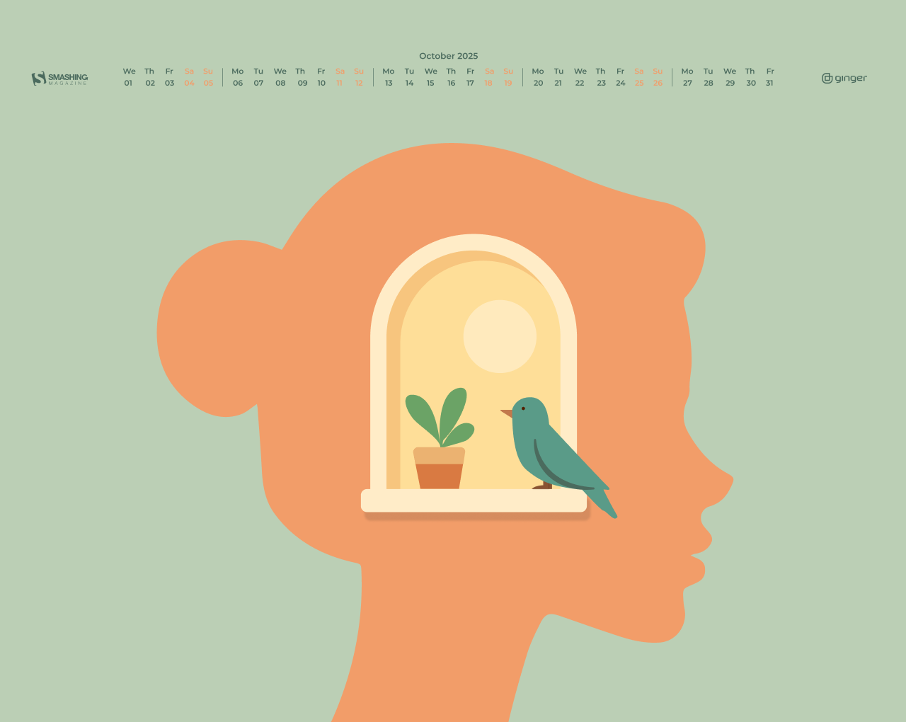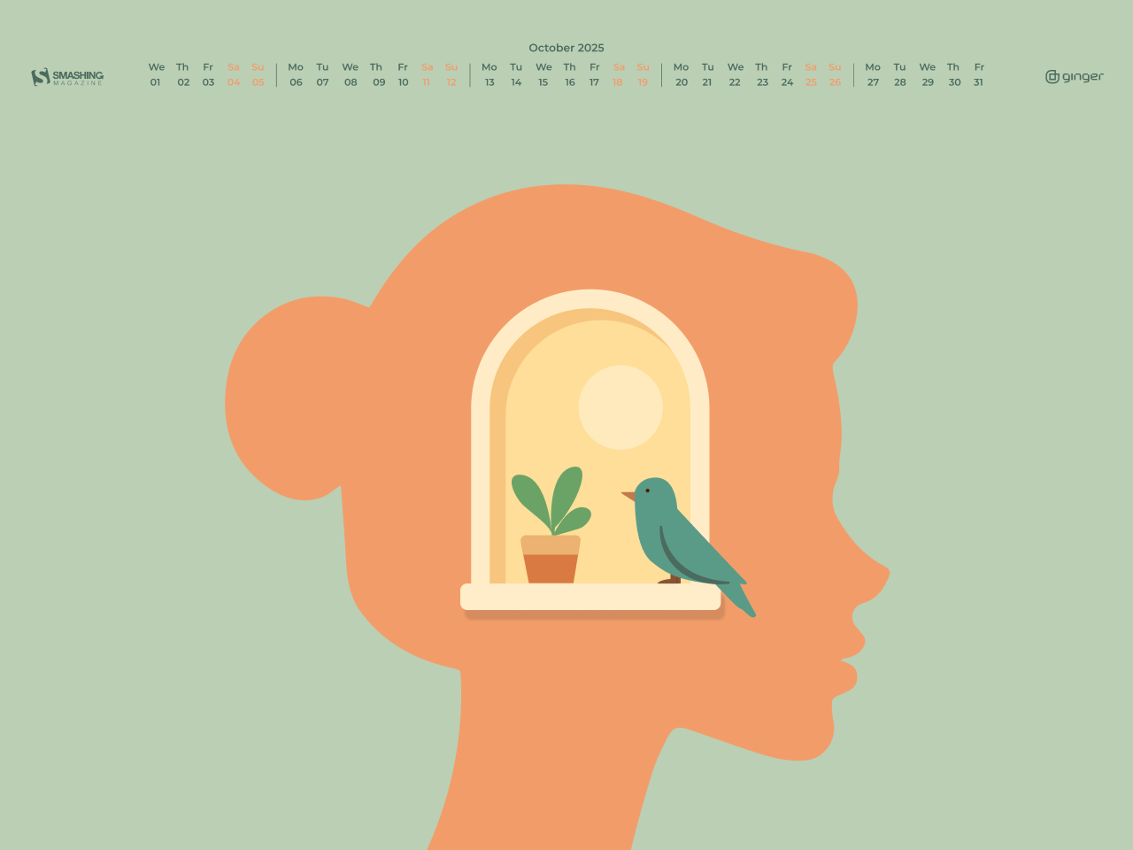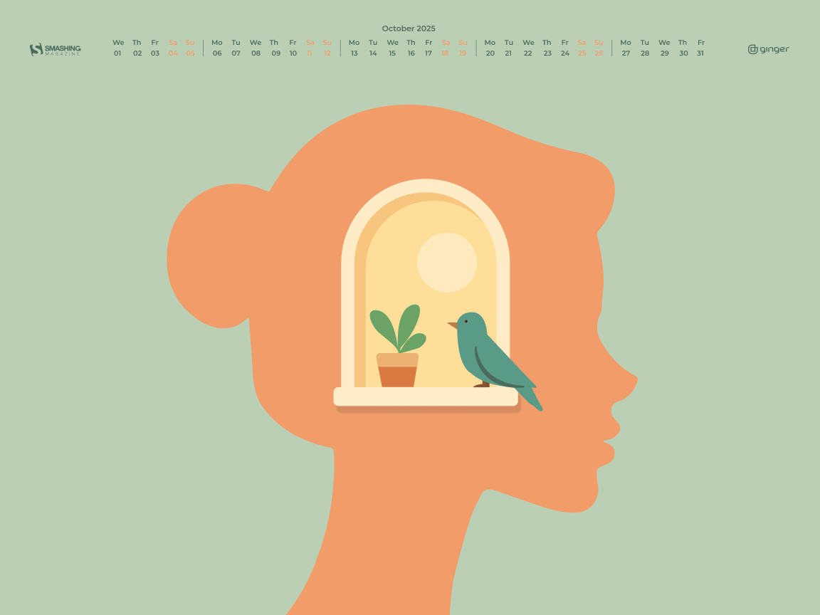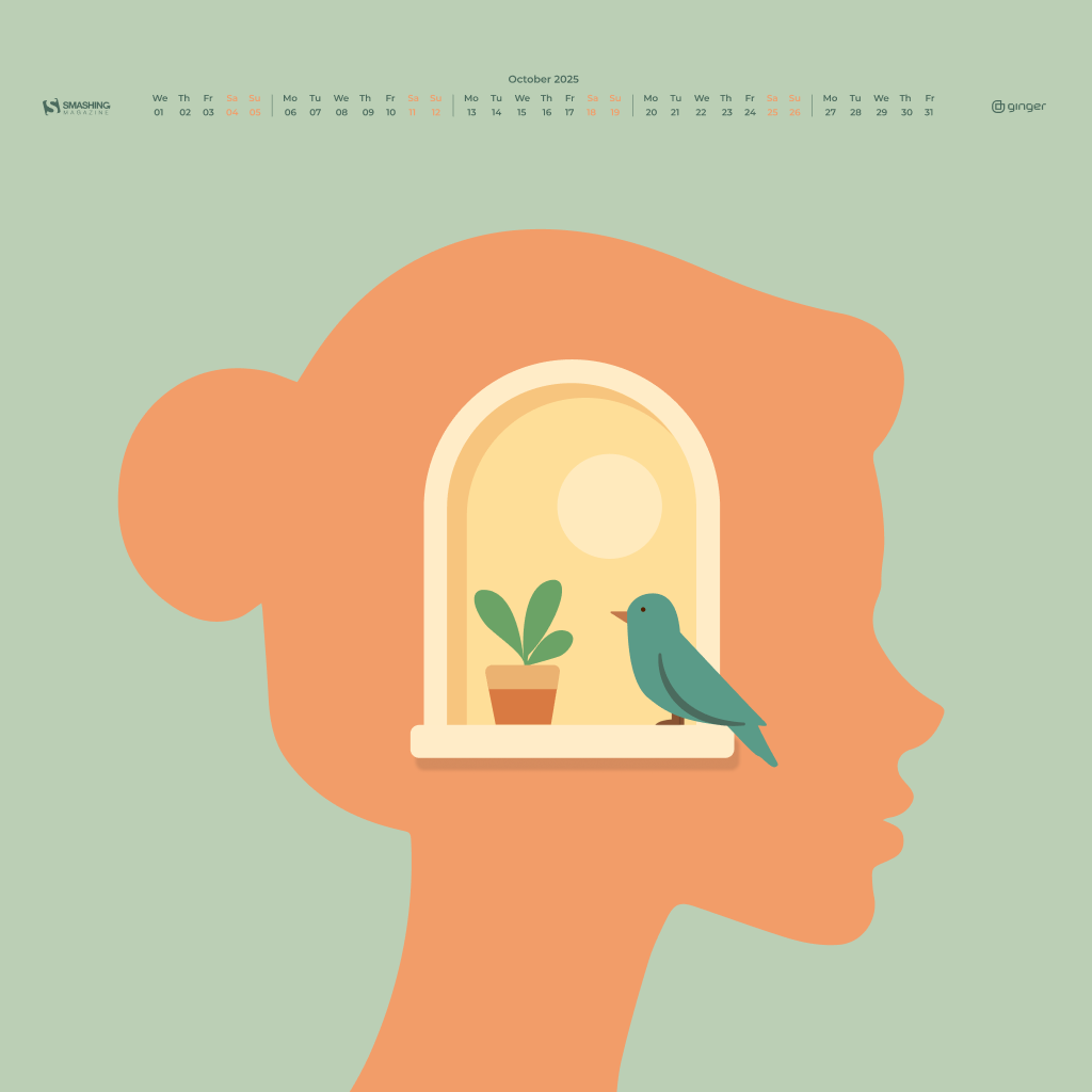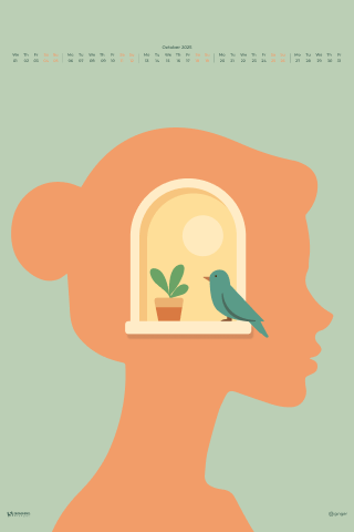 In October, we observe World Mental Health Day. The open window in the head symbolizes light and fresh thoughts, the plant represents quiet inner growth and resilience, and the bird brings freedom and connection with the world. Together, they create an image of a mind that breathes, grows, and remains open to new beginnings. — Designed by Ginger IT Solutions from Serbia.