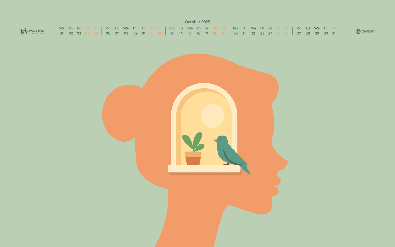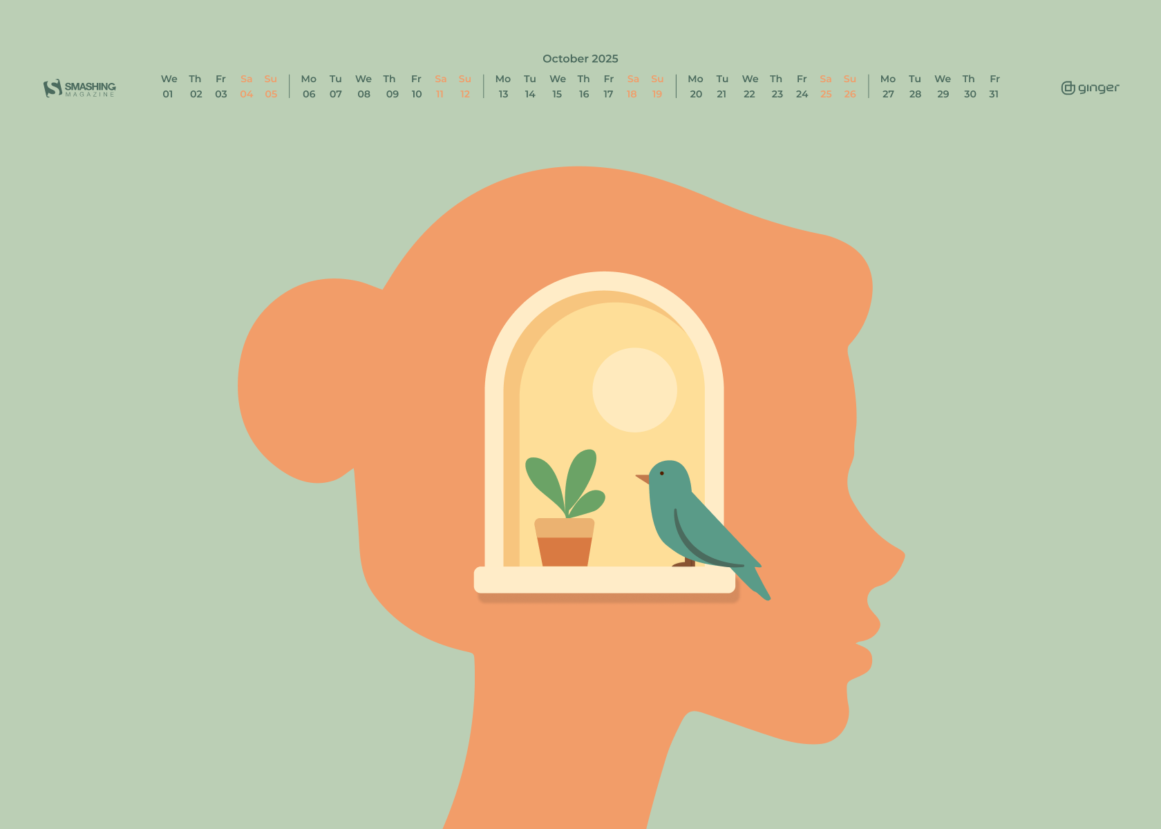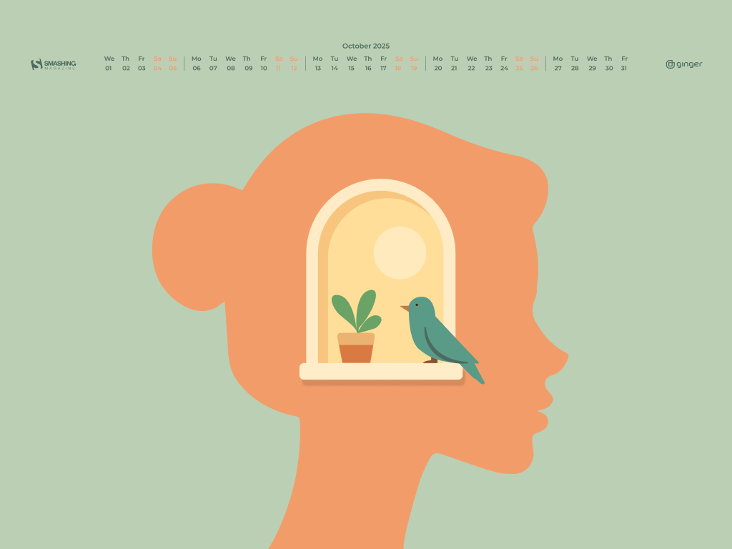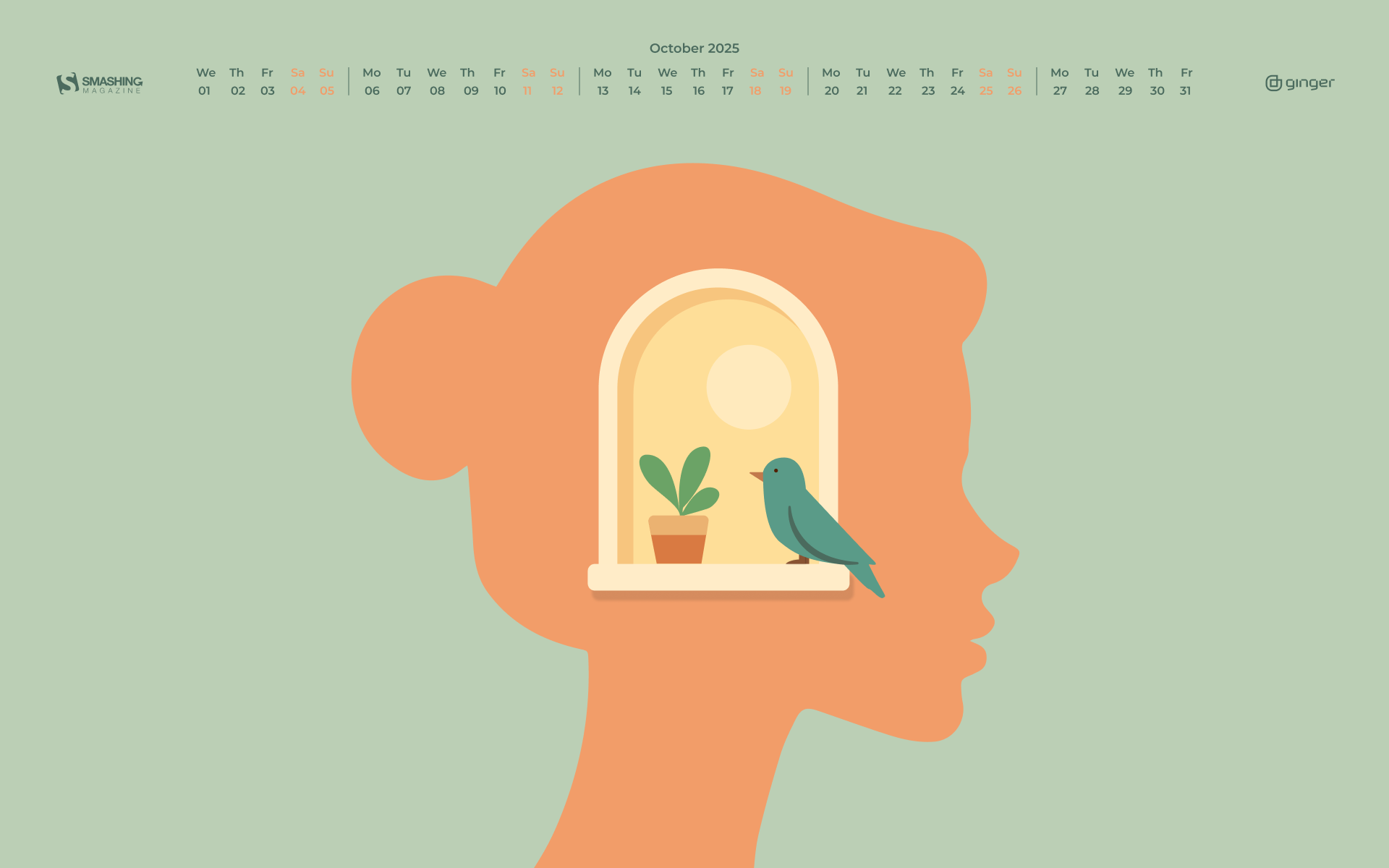 In October, we observe World Mental Health Day. The open window in the head symbolizes light and fresh thoughts, the plant represents quiet inner growth and resilience, and the bird brings freedom and connection with the world. Together, they create an image of a mind that breathes, grows, and remains open to new beginnings. — Designed by Ginger IT Solutions from Serbia.